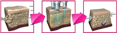 le praticien exerce une série de mouvements. Cette production de chaleur par la radiofréquence favorise une remise en tension (parfois instantanée) de la peau grâce à une rétractation des fibres de collagène et de l’élastine.